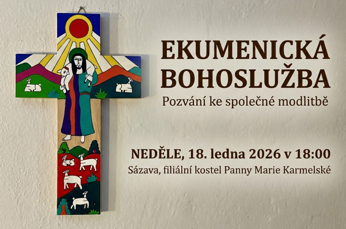 Přijměte srdečné pozvání na ekumenickou bohoslužbu, která proběhne v neděli 18. ledna 2026 od 18:00 v Sázavě ve filiálním kostele Panny Marie Karmelské. Všichni jsou zváni ke společné modlitbě.